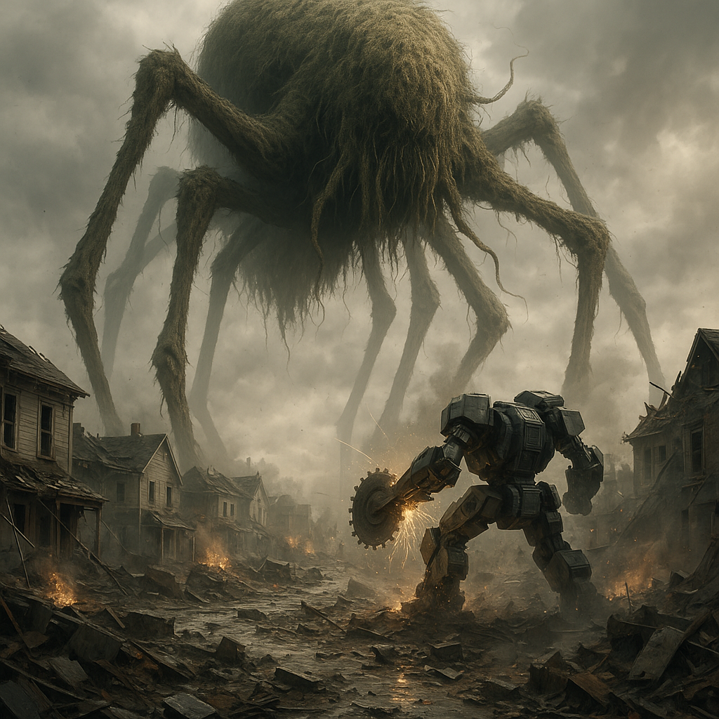 At first, the townspeople thought it was a storm impending—a wayward lightning strike, perhaps, after days of humid buildup. But this was no storm. The ground trembled faintly before the first screams pierced the town square. Over the horizon loomed a beast beyond comprehension: a spider-like colossus, its legs stretching skyward like wooden pillars, each step punctuated by the grinding crash of earth splitting beneath its weight. It's the stuff monster movies were conceived from, yet this monstrosity was no fictional construct.