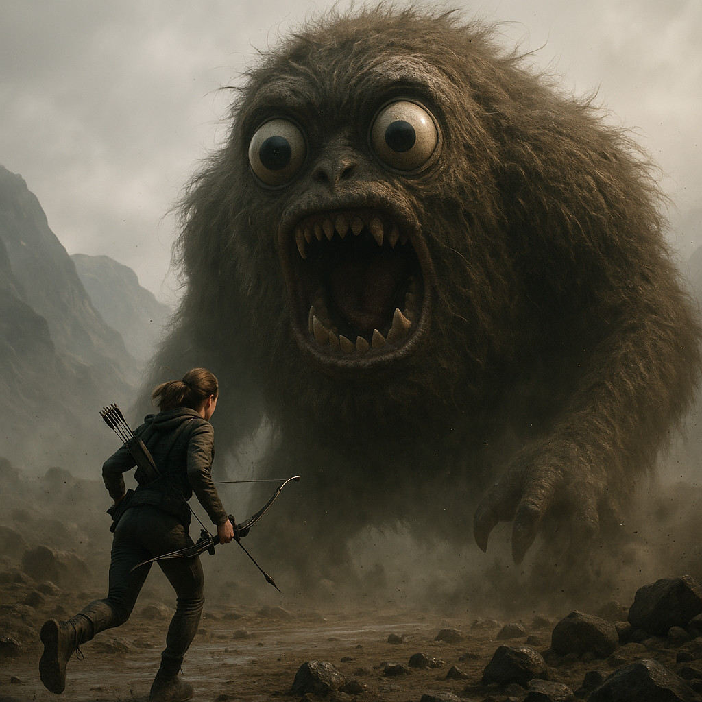 The Monolith was a grotesque colossus of flesh and fur, its sheer bulk resembling a mountain that had come to life. Its dense, wild coat glistened with the moisture of the world it had ravaged, and its huge, bulbous eyes scanned its surroundings like searchlights. Each movement of its hulking body sent tremors through the ground, displacing boulders and sending gouts of dirt into the air. Its mouth opened wide, revealing rows of serrated teeth that seemed capable of grinding whole buildings into dust. It emitted a guttural roar, a sound so powerful it silenced the wind and disrupted the mist, creating a temporary vacuum of sound and motion before the world rushed back in.