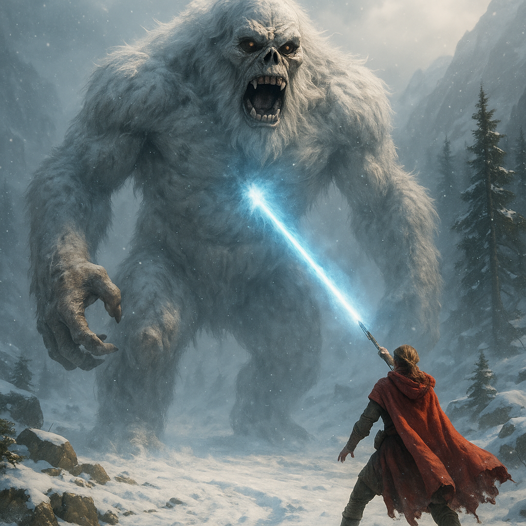 As she reached the cliff’s edge, Ava froze. Below her stretched a small valley surrounded by jagged peaks. But what dominated the landscape was a towering monstrosity covered in shaggy white fur, moving with a terrifying majesty. Its heavily muscled form seemed immune to the freezing air, each step causing the snow to tremble. Its face was a twisted mockery of life, with deep-set, piercing eyes and a gaping maw lined with razor-sharp teeth. Even in the moonlit glow, the creature’s visage was haunting—a blend of primordial fury and raw power.