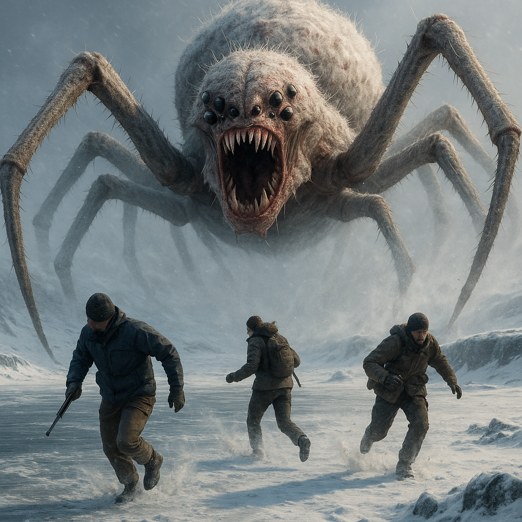 From the veil of the storm ahead emerged the creature—a behemoth many times larger than any terrestrial species, its massive, spider-like body covered in a disturbingly organic blend of white and pink fur. Its multi-eyed gaze fixed on the group as its spindly legs made sharp, chittering sounds as they pierced the ice. The creature's mouth opened to reveal rows of jagged teeth, each glistening like shards of ice.