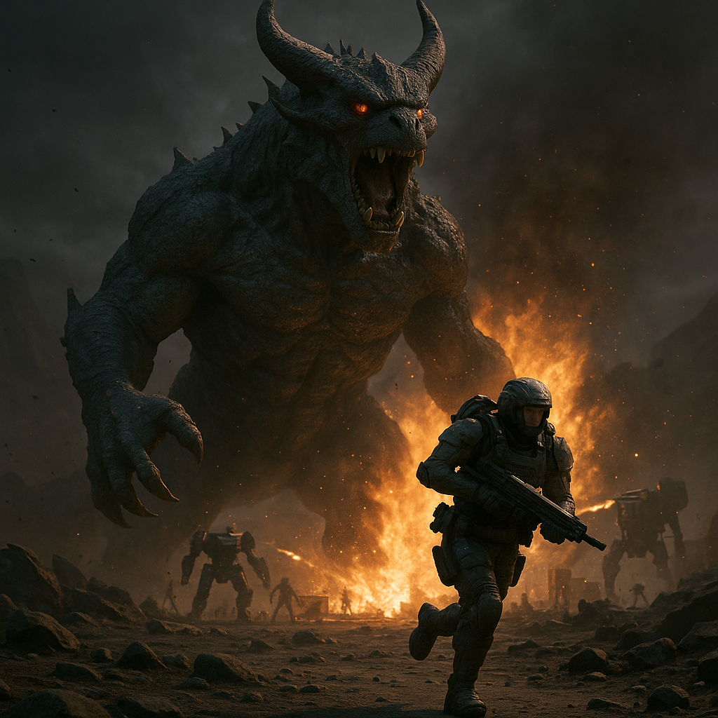 Orbital Command’s drop units unleashed a torrent of pain, kinetic railguns and plasma-mounted cannons raining down firepower. The beast roared and charged toward them, swatting a gunship out of the sky with a single swipe of its claws. The ship exploded in a flash of light, forcing Amelia to shield her eyes as she sprinted through the chaos. Another rift in the ground opened nearby, the quakes threatening to swallow her whole.