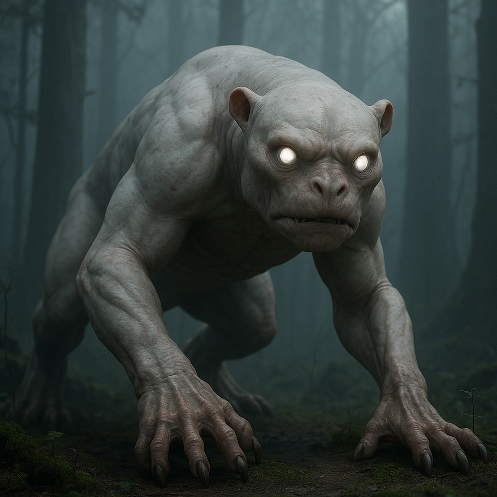 Two massive, glowing orbs blinked in unison from the shadows between a pair of ancient oaks. Eyes. Pupil-less, eerie, fixed with an intelligent hunger that made their stomachs drop. The creature’s hulking form shifted just enough to catch their flashlights. Pale skin stretched tight over a muscular, reptilian body. Four powerful limbs ended in claws that could shred through anything they touched. Its snout-like face twisted into what could only be described as a grotesque leer.