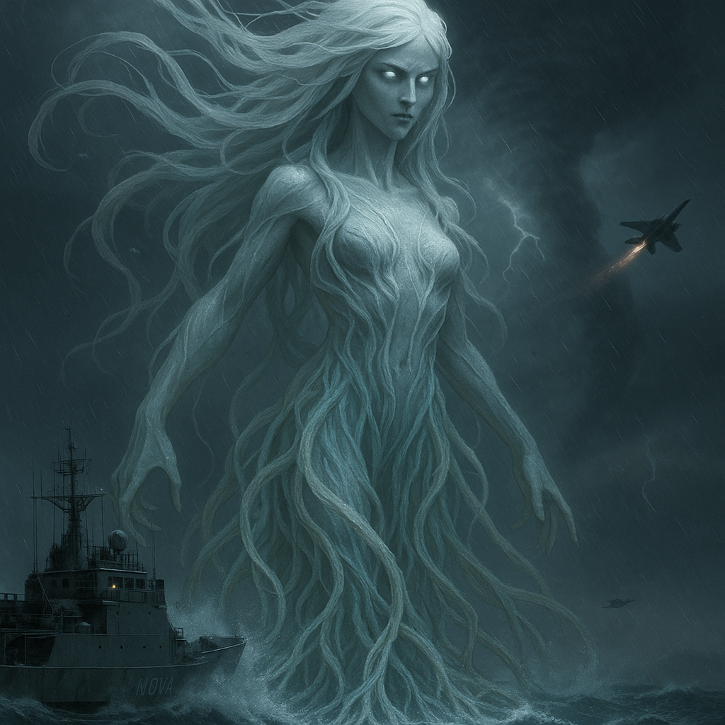 As the argument raged, Nereid Prime breached the surface, lifting itself into the air with impossible grace, its tendrils coiled underneath like the roots of some massive, otherworldly tree. Around it, the massive storm clouds overhead spiraled into a vortex. Raindrops hit the Aegis Nova like bullets, and waterspouts surged around the ship, threatening to end them before they could act.